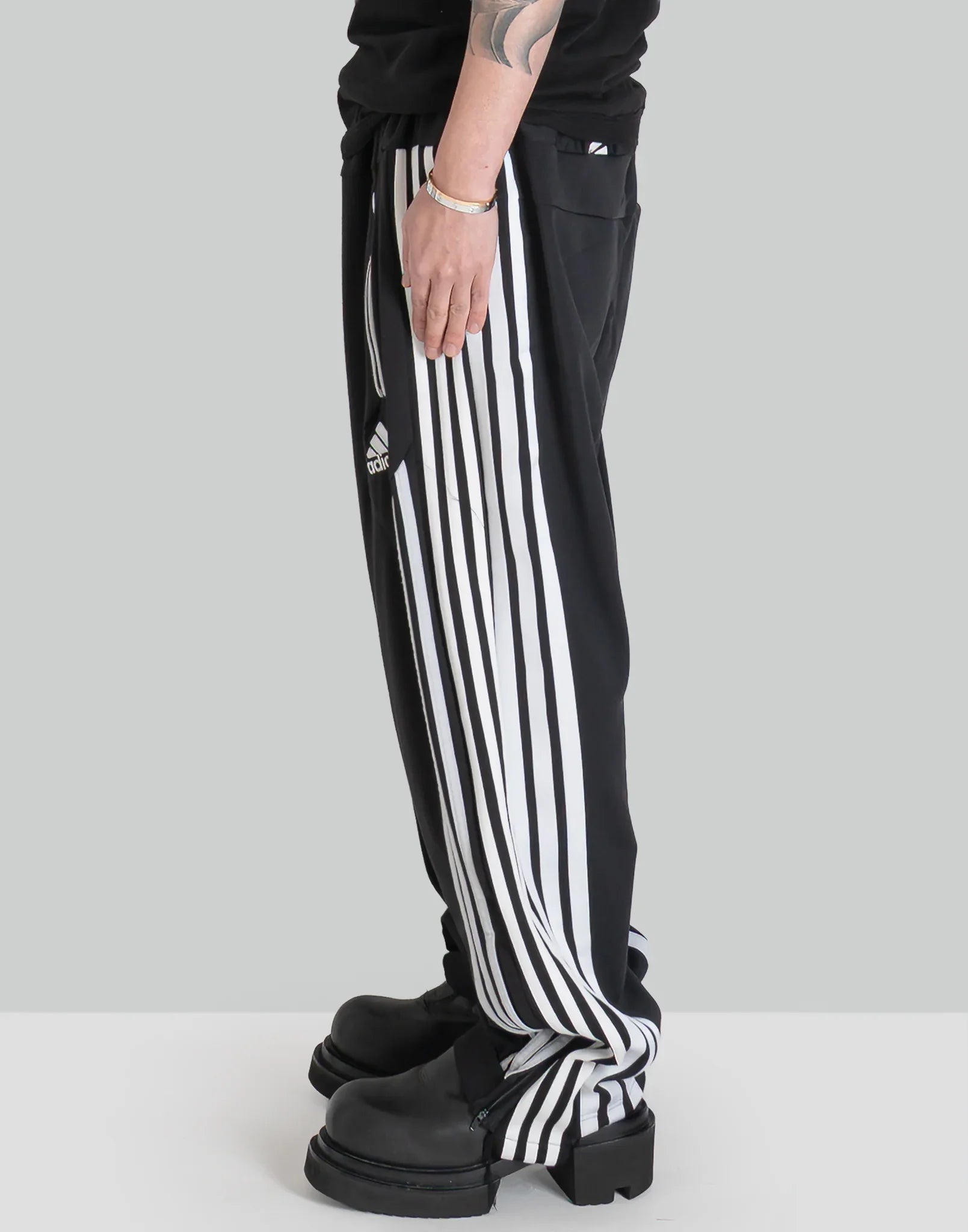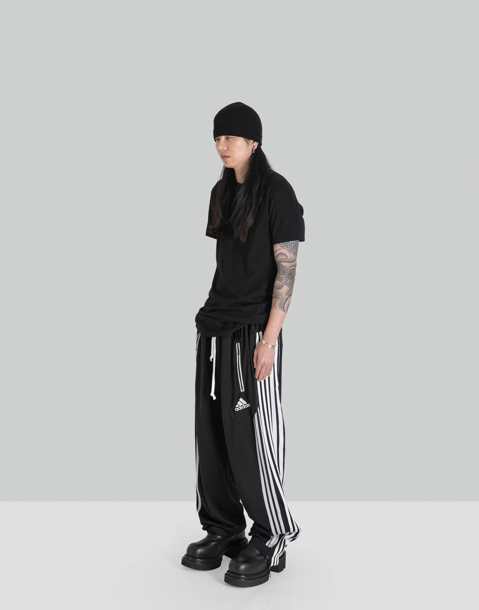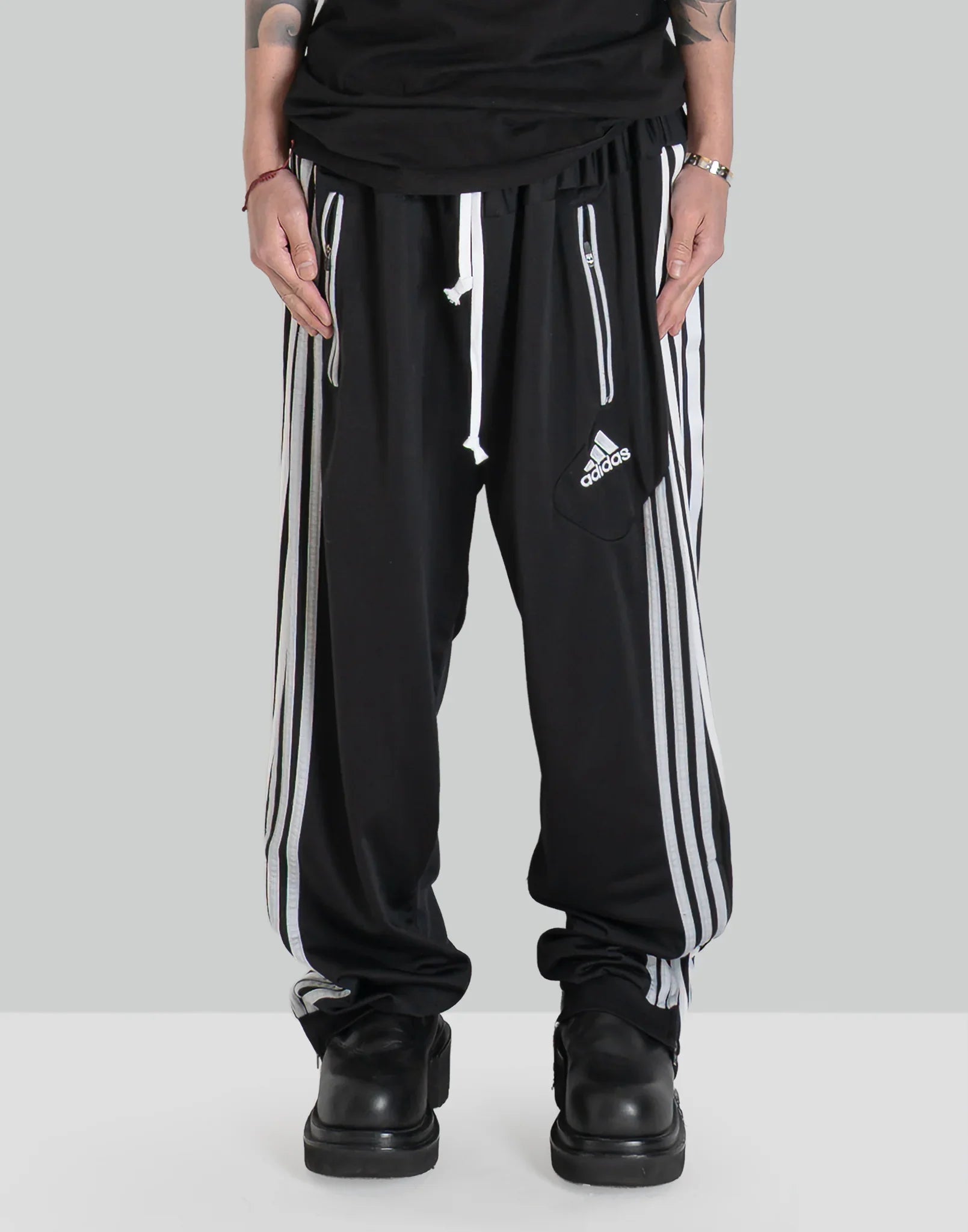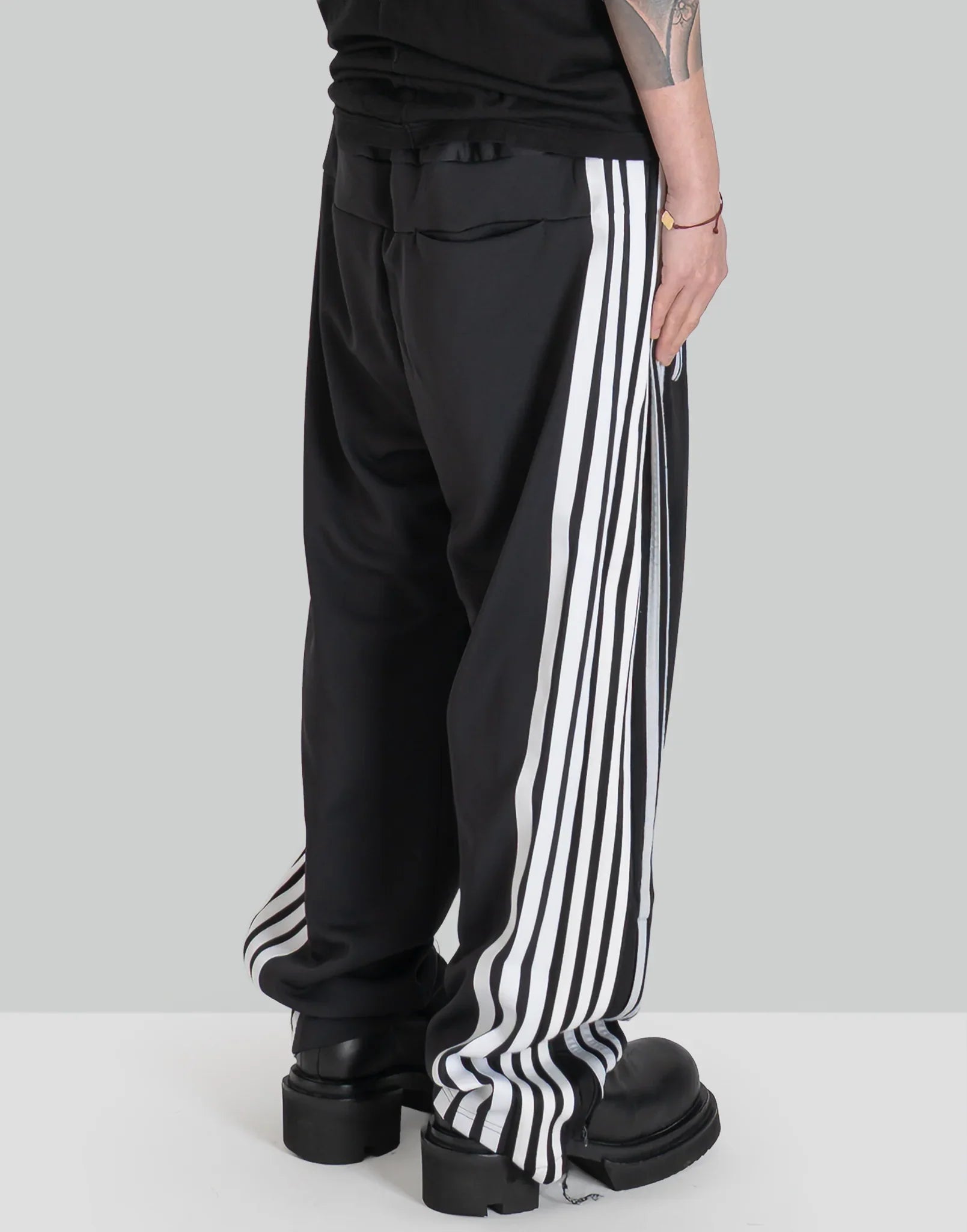 2枚の異なったトラックパンツを解体後、再構築したドッキングPT。ワイドなシルエットと異なったコントラストが楽しいアイテム。
