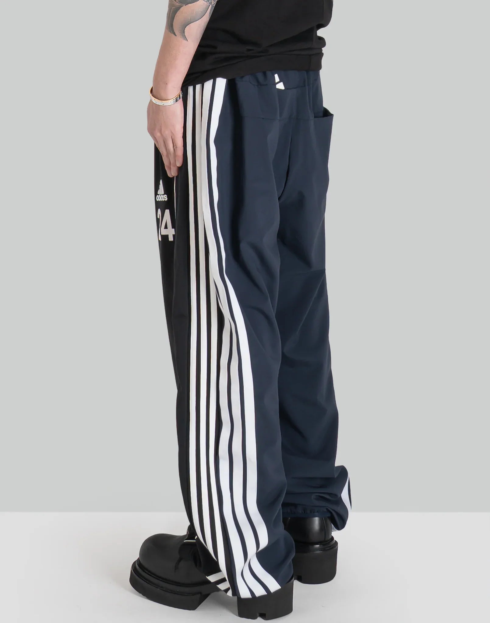 2枚の異なったトラックパンツを解体後、再構築したドッキングPT。ワイドなシルエットと異なったコントラストが楽しいアイテム。